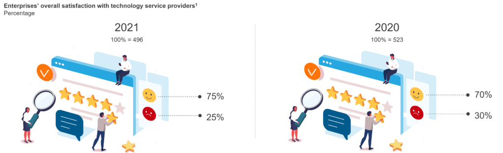 Emerging from the pandemic, IT service and technology providers’ enterprise satisfaction ratings increased for the second consecutive year, moving up from 70% to 75% last year, according to our IT Services Enterprise Pulse Report 2022.