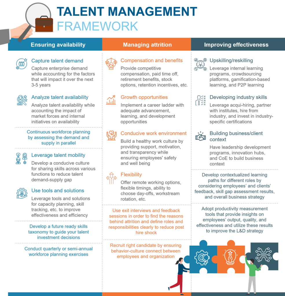 IT service and technology providers need to adopt a continuous workforce planning model keeping in mind the factors that impact talent demand and supply. They also must take a holistic approach to manage attrition by being employee-centric and investing in learning and development to improve employees’ effectiveness.