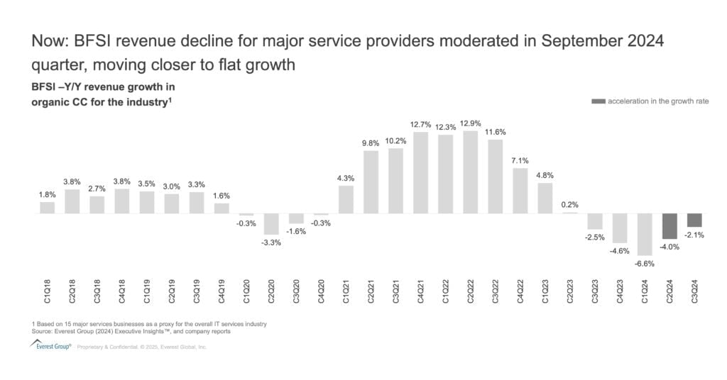BFSI firms are channeling investments in gen AI to enhance both customer and employee experiences, while mid- and back-office processes remain largely untapped opportunities for service providers.